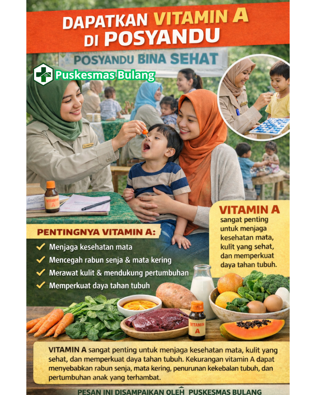 Sebagai bentuk komitmen dalam meningkatkan kesehatan masyarakat, Puskesmas Bulang menyelenggarakan pemberian kapsul Vitamin A secara gratis melalui Posyandu yang tersebar di seluruh wilayah Kecamatan Bulang.