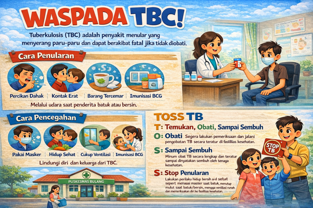 Melalui edukasi dan kesadaran bersama, kita dapat mencegah penyebaran TBC di lingkungan sekitar. Jika mengalami gejala TBC seperti batuk berkepanjangan, penurunan berat badan, atau sering berkeringat pada malam hari, segera lakukan pemeriksaan di Puskesmas Bulang untuk mendapatkan pemeriksaan dan pengobatan yang tepat.