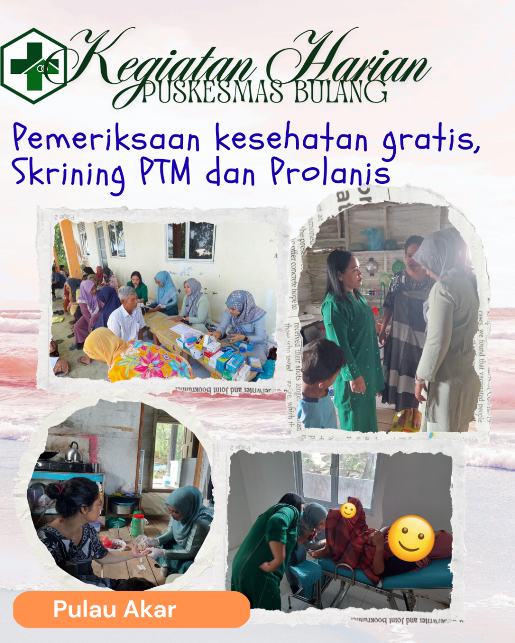 Puskesmas Bulang melaksanakan kegiatan Pemeriksaan Kesehatan Gratis (PKG), skrining Penyakit Tidak Menular (PTM), serta pelayanan Program Pengelolaan Penyakit Kronis (Prolanis) di Pulau Akar sebagai upaya meningkatkan akses dan kualitas pelayanan kesehatan masyarakat, khususnya dalam deteksi dini penyakit serta pengendalian penyakit kronis. Kegiatan ini menjadi bagian dari pendekatan pelayanan kesehatan terpadu yang menyasar seluruh kelompok usia, terutama masyarakat dengan faktor risiko PTM.