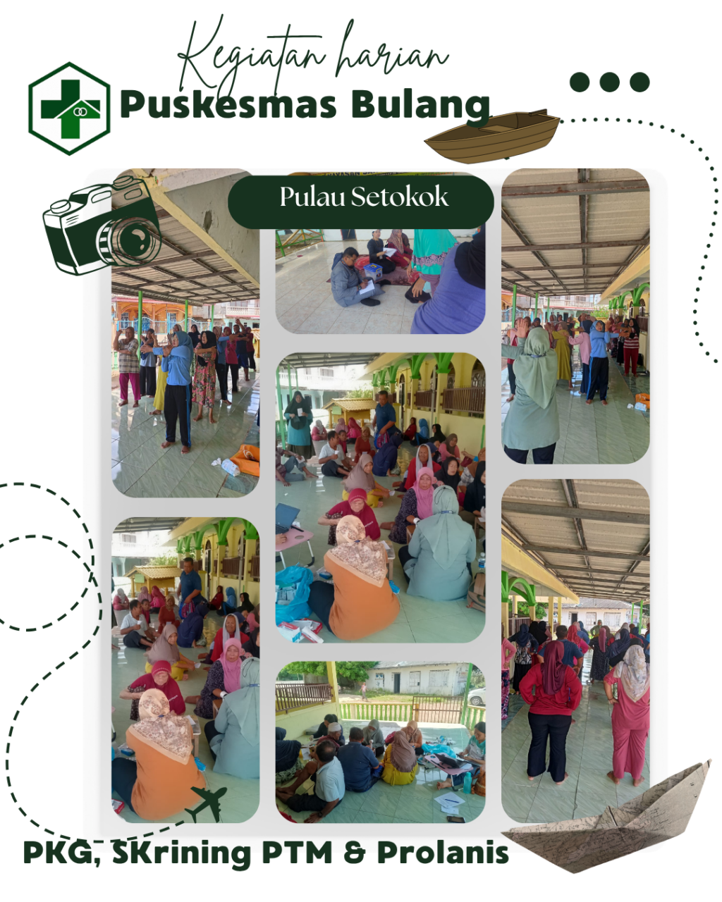 Puskesmas Bulang melaksanakan kegiatan Pemeriksaan Kesehatan Gratis (PKG), skrining Penyakit Tidak Menular (PTM), serta pelayanan Program Pengelolaan Penyakit Kronis (Prolanis) di Pulau Setokok sebagai upaya meningkatkan akses pelayanan kesehatan serta mendorong deteksi dini penyakit di masyarakat. Kegiatan ini menjadi bagian dari komitmen Puskesmas dalam memberikan pelayanan kesehatan yang promotif, preventif, dan berkesinambungan, khususnya bagi masyarakat kepulauan.
